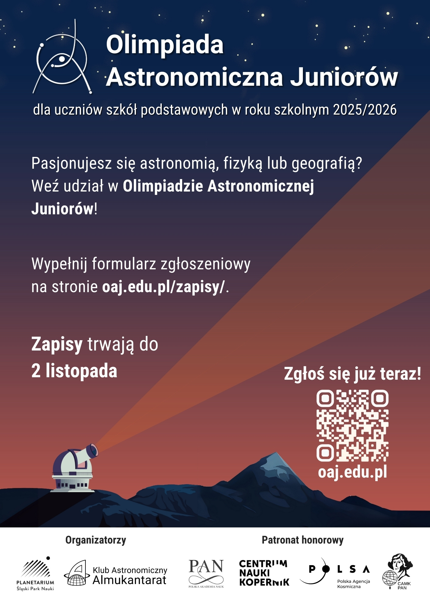 Plakat Zapraszamy do pobierania i rozpowszechniania plakatu Olimpiady Astronomicznej Juniorów. Wersja .pdf do druku Plakat z roku szkolnego 2024/2025